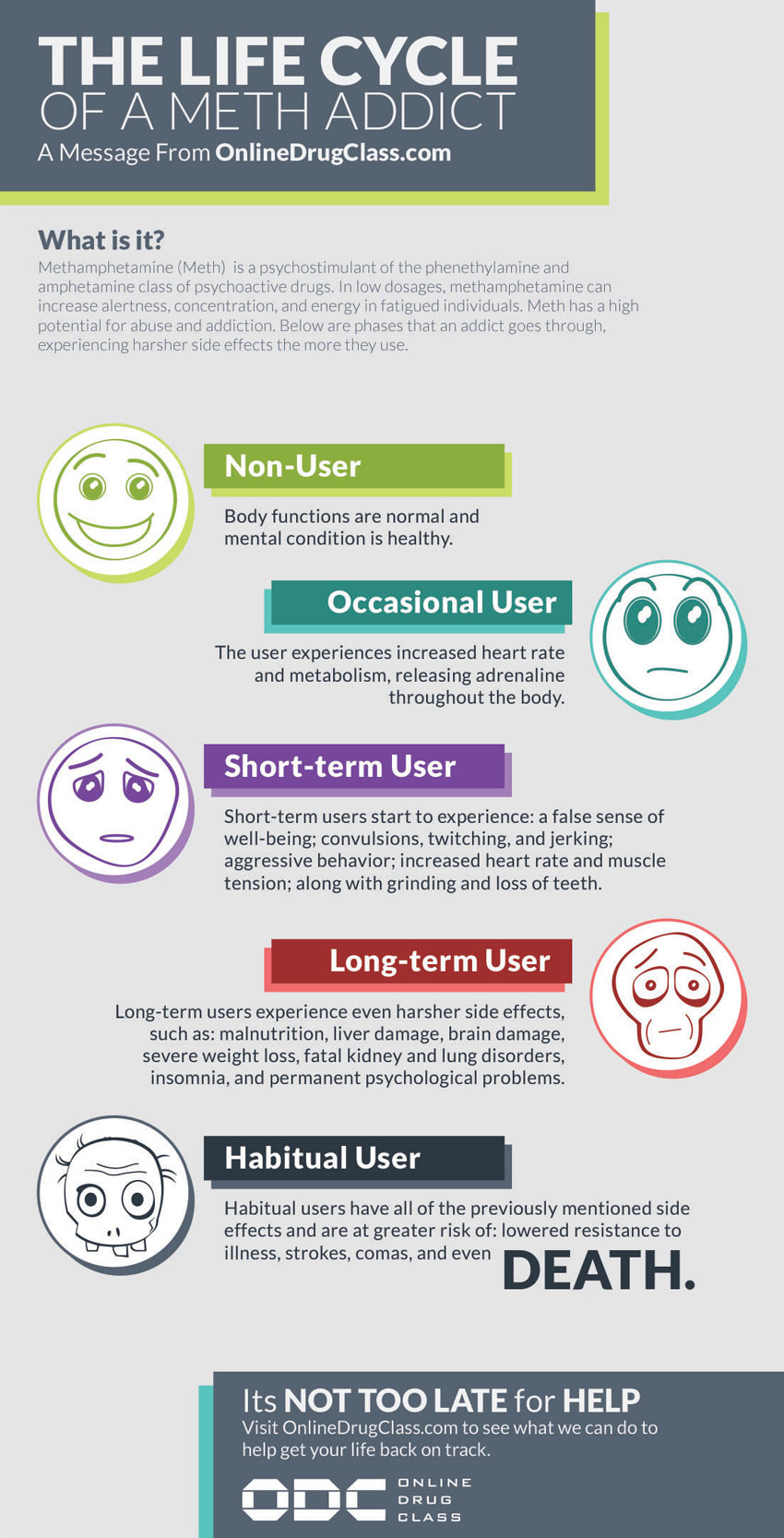 Meth is known by many names, Ice, Crank, Speed, to name a few. No matter what you call it the impact methamphetamine abuse has on the body and mind is incredibly frightening. From hallucinations to meth mouth there seems to be no limit to the harm it can cause a user from the first high. This infographic, provided by Online Drug Class, demonstrates the meth addict’s lifecycle from beginning to the end.